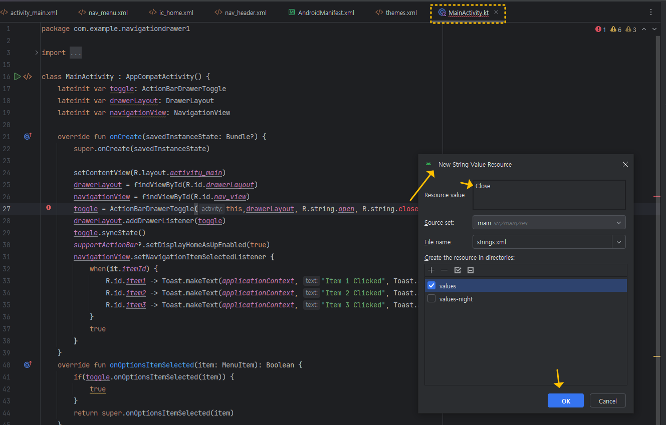 위 코드에서 작성 중간에 toggle = ActionBarDrawerToggle(this,drawerLayout, R.string.open, R.string.close) 코드에서,