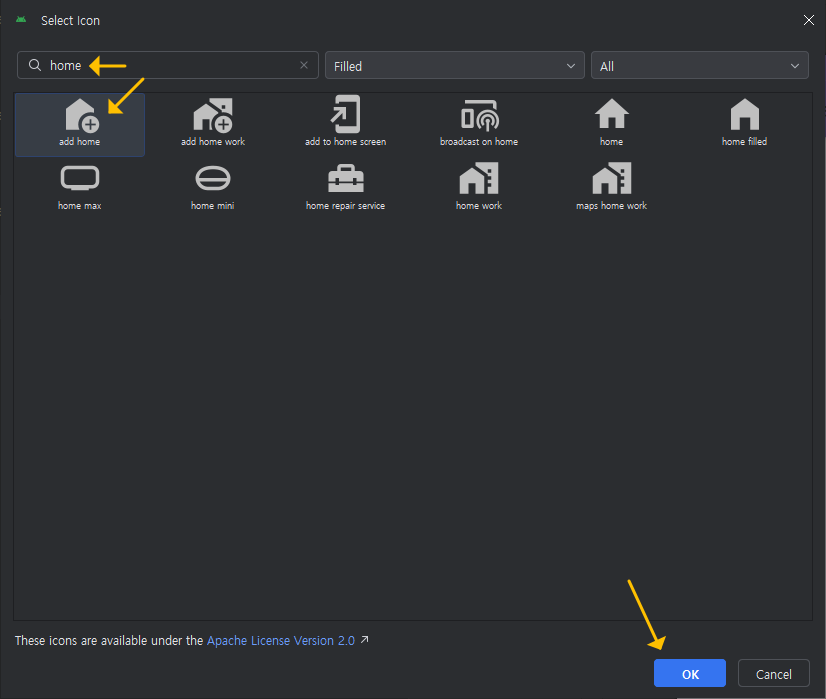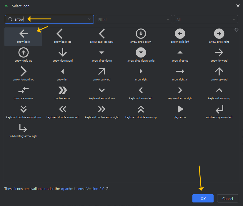 검색창에 "arrow"로 검색하고 "arrow back"를 선택 후, OK 클릭하세요.