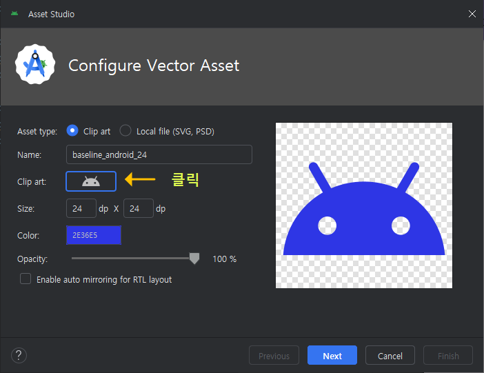 Vector Asset창이 열리면 Clip art를 클릭하세요.
