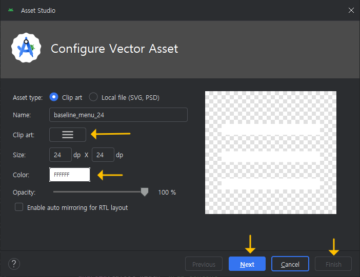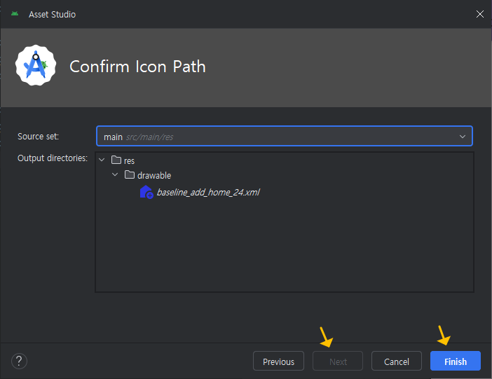 그럼, 안드로이드 스튜디오의 프로젝트 탐색창에 Res >> drawable >> 폴더에 아래와 같이 화살표 파일이 다운로드된 것을 볼 수 있어요.