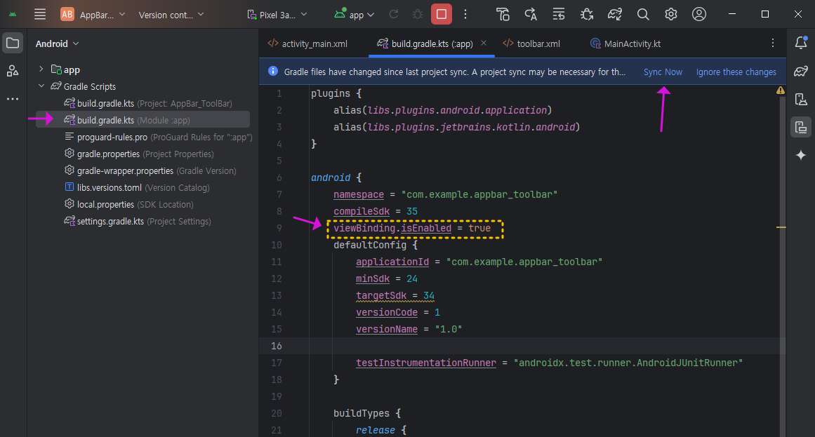 ② build.gradle.kts에 뷰바인딩 기능 사용을 위해, "viewBinding.isEnabled = true"를 추가하고 "Sync Now"를 클릭해 주세요.
