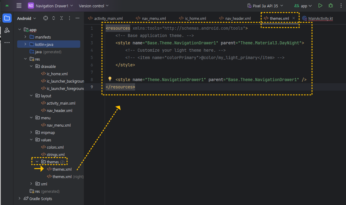 이렇게 하면 기본적으로 작성해야 할 것은 모두 작성했는데요, 실행해 보면, Navigation View를 선택할 수 있는 Bar가 보이지 않는데요, 이는 안드로이드 기본 설정이 NoActionBar가 적용되어 있기 때문에 그렇습니다. 이 때는 Action Bar가 보이도록 아래처럼 res>> values >> themes 폴더에 있는 themes.xml 파일을 수정해 주세요. 필요 시 night(다크 디스플레이 모드)화면 모드의 themes.xml 메뉴에도 적용해 주세요.
