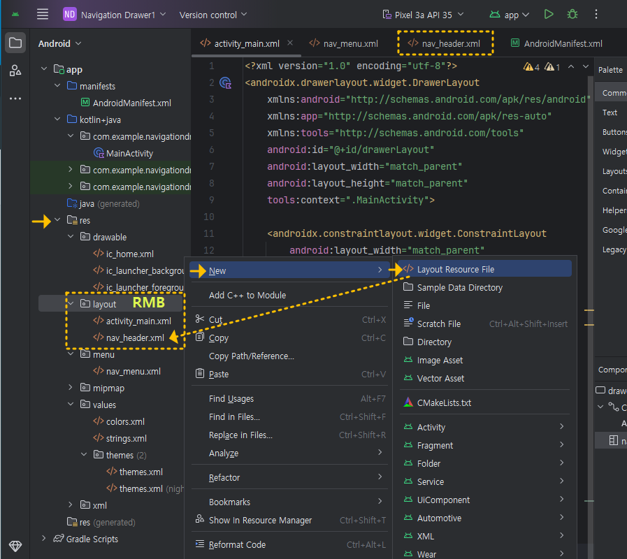 ③ layout 폴더에서 마우스 우클릭(RMB) >> New >> Layout Resource File을 선택하여 toolbar.xml 파일을 만들어 주세요.