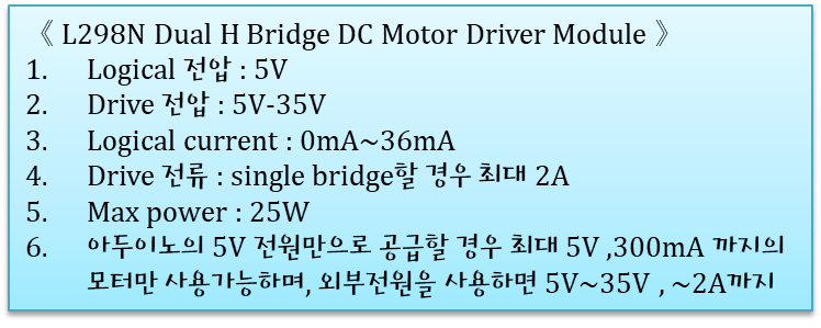 ※ 실습회로 도면 1에 보면, 9V 건전지는 아두이노쪽에 전원공급용으로 쓰였구요. L298N모듈에 보면, +5V~(모터, 별도전원) 이라고 되어 있는 부분에는 5V이상 되는 전원을 따로 넣어(연결) 주라는 의미에요.
