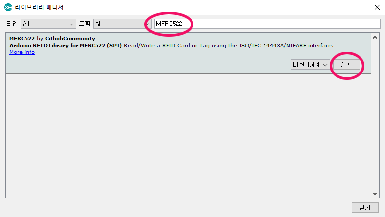 2. 아두이노IDE에서 MFRC522 라이브러리를 검색후 설치한다.