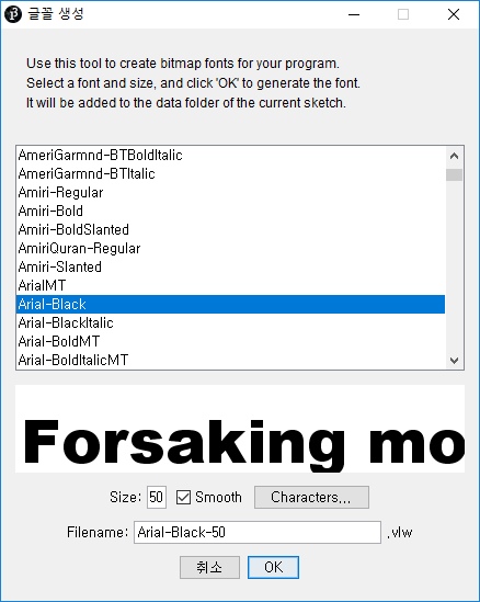 (프로세싱 출력 화면에서 윈도의 폰트를 사용하기 위해서는 아래와 같은 과정을 통해 , 프로세싱에서 사용할 수 있는 비트맵 형태의 폰트로 변환하는 과정이 필요하다)