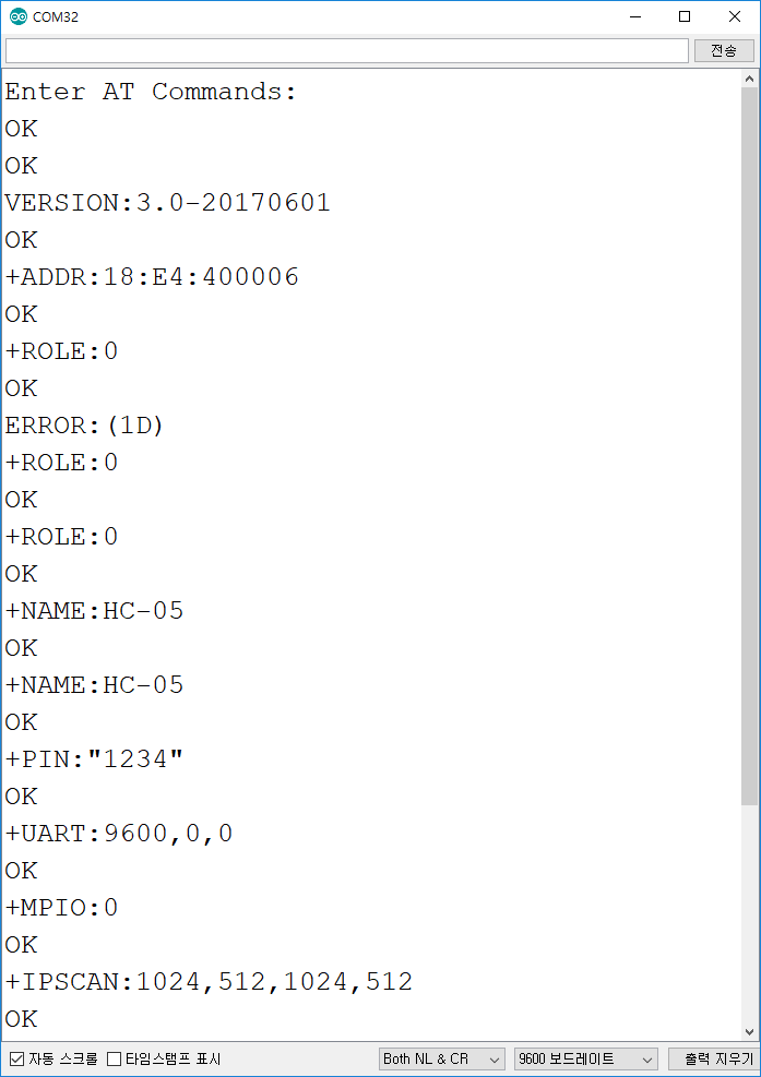 그런 다음 아두이노 IDE의 시리얼 모니터 창을 열고 아래와 같은 AT 통신 명령어를 이용하여 마스터/슬레이브 설정과 여러가지 설정이 가능해진다.