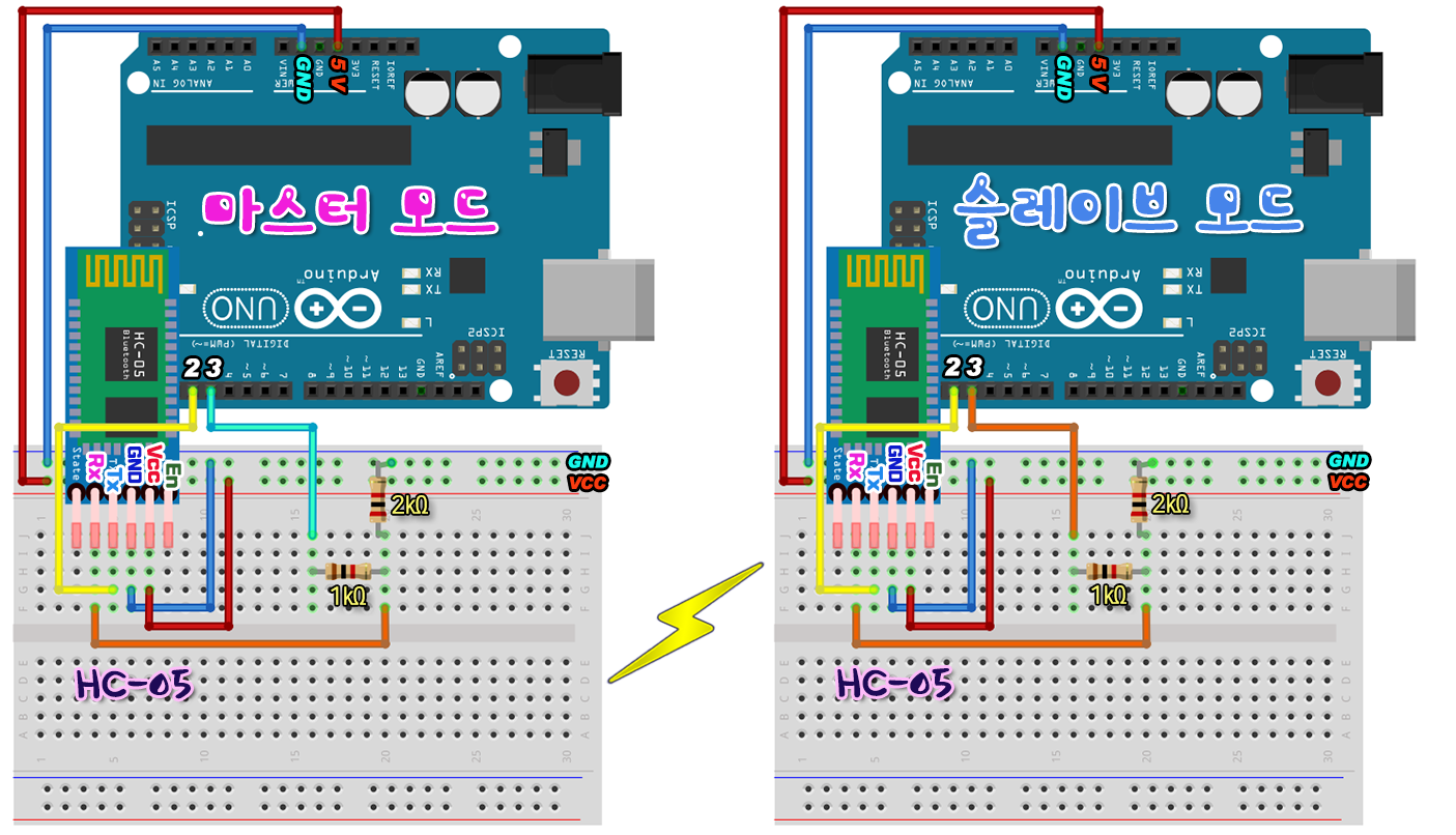 아래와 같이, 마스터 회로와 슬레이브 회로 두 가지를 준비하고 실습한다. 이때, En 단자는 연결하지 않으며, 블루투스 모듈의 보호를 위해 분배저항을 반드서 넣어서 작업한다.