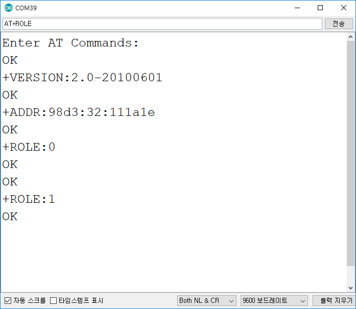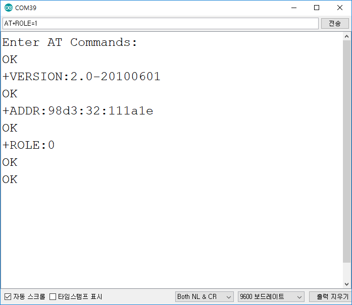 (다시 슬레이브 모드로 전환하기 위해서는 : AT+ROLE=0 ⏎ )