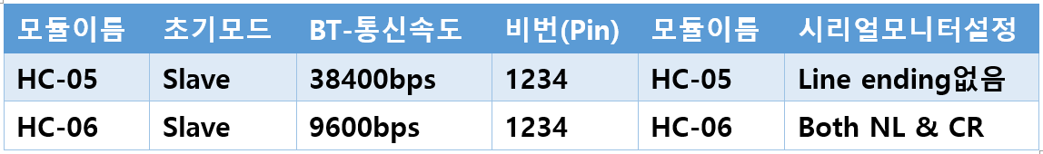 그리고 중요사항으로 HC-05 모듈과 HC-06 모듈의 초기 설정값(공장 초기값)은 아래와 같다. (단, 펌웨어 버전에 따라 다를 수 있음)