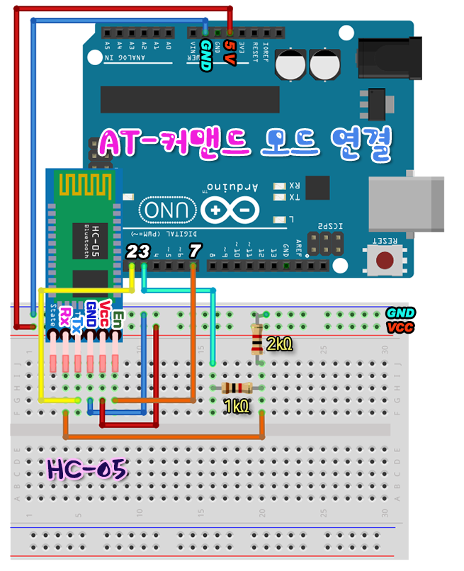 ※ 이상과 같이 설정이 모두 끝난 후에는 아래 회로 처럼, 7번포트에 연결한 Enable 단자를 제거하고, HC-05모듈의 커맨드 모드 종료를 위해 전원을 제거후 다시 연결한다. (HC-05의 LED가 다시 빠른 속도로 깜빡임)