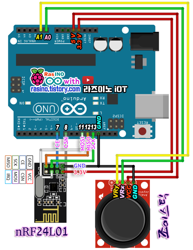 - 아래 실제조립 회로에서는 nRF24L01 어뎁터 소켓을 연결하여 사용하였다. 별다른 큰 차이는 없으며 3.3V 전원을 사용하지 않고 동일하게 5V전원으로 연결시키기 위한 차이 일뿐으로, 소켓을 사용하지 않아도 무방하다.