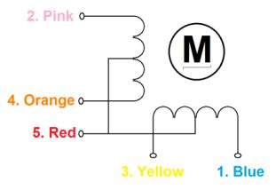 유니폴라 방식의 모터로서(1,3,4,2번으로 전류가 들어가며 5번(Red) 공통단자로 전류가 흘러나오는 연결 구조이다, 1→5 , 3→5, 4→5, 2→5 )