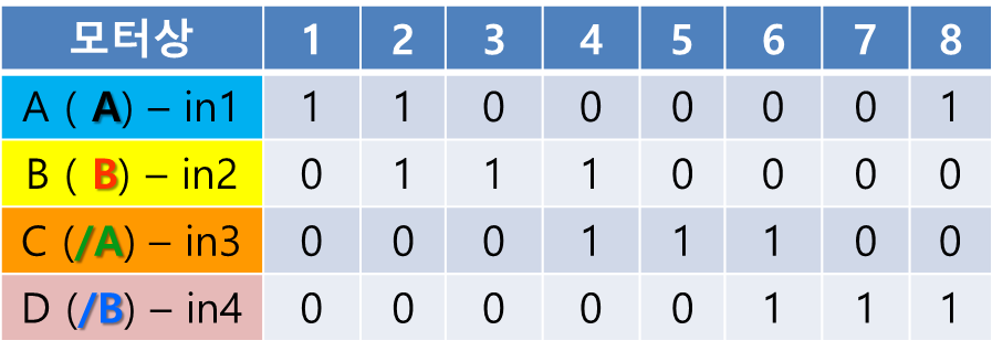 D → C → B → A의 순서대로 흘려주면 CCW(반시계 방향) 으로 모터가 회전하게 된다.