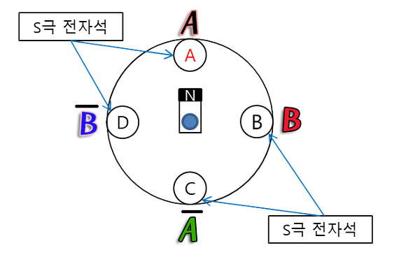 ※ 색깔을 주의 깊게 보면서, A → B → C → D의 순서대로 켜지도록 전류를 흘려주면 CW(시계방향),