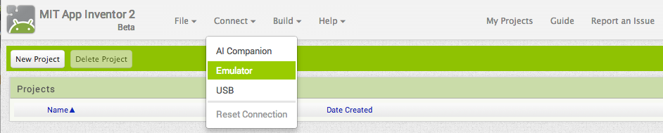 - 에뮬레이터 실행을 위해서는아래 그림처럼 앱 인벤터 메뉴에서 "Emulator"를 클릭 한다.