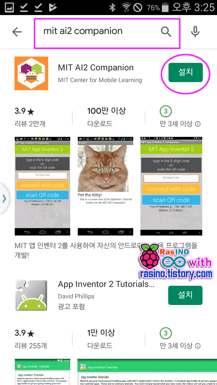 스마트폰에서 플레이스토어에 접속한 후 AI2 companion 을 검색하여 설치한다.