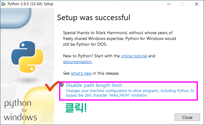 < 6. 'Close'를 클릭하여 설치 마무리 >