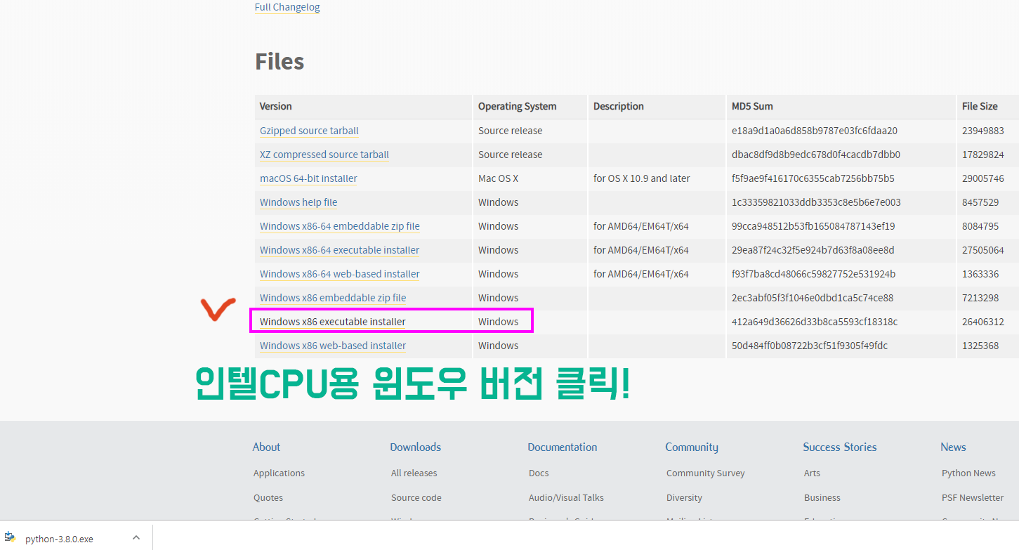 「 Python 3.8.0 (32-bit) 설치프로그램 다운로드 클릭! 」 ( 25.1 Mb )