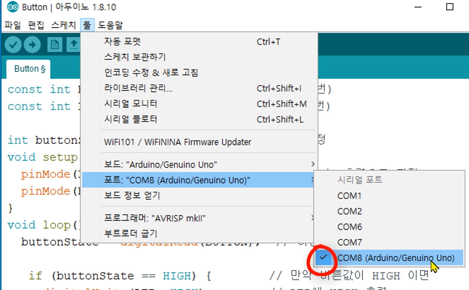 4. 아두이노 ↔ PC 시리얼 통신을 위한 포트 선택 확인!