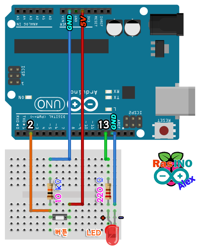 - 아두이노에 푸쉬버튼 스위치를 달고 버튼의 입력을 감지하여 LED를 켜고 끄는 실습을 진행합니다.