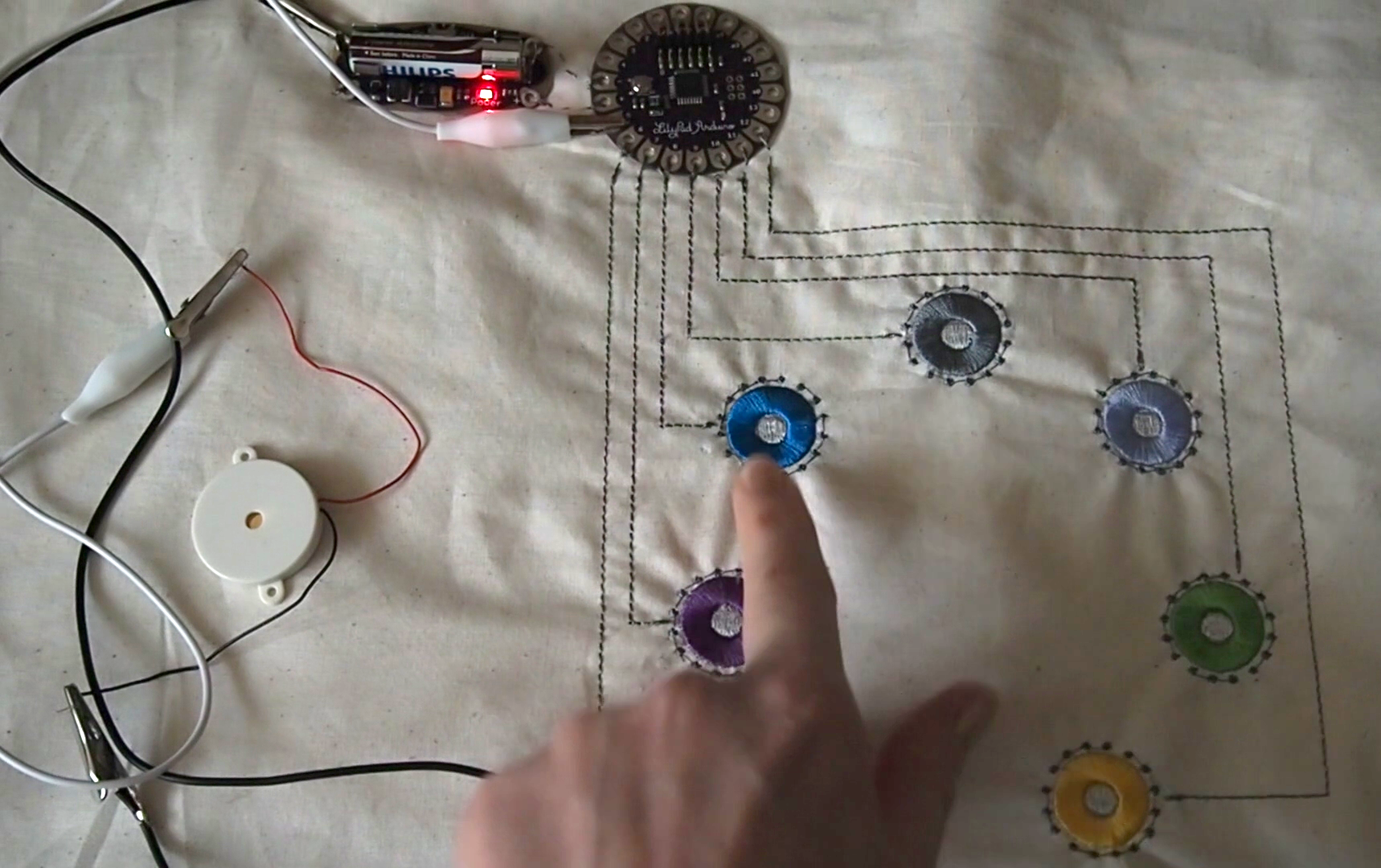 회로 연결에는 전기가 통하는 전도성 실( Conductive thread)을 이용합니다.
