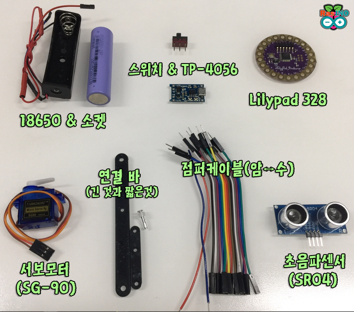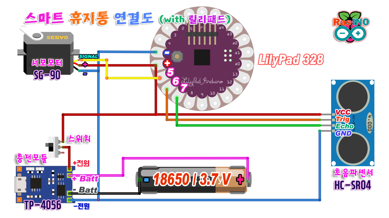 우선, 고려사항으로 센서는 초음파센서(HC-SR04)를 이용해 보겠습니다. 그리고 메인보드는 아두이노 우노, 미니, 프로미니, 모두다 사용할 수 있지만, 작으면서도 얇은 릴리패드 328을 한 번 사용해보겠습니다. 그리고, 안드로이드 스마트폰이나 각종 충전단자 규격으로 많이 사용되는 마이크로 5핀을 사용하여, 충전 가능한 휴지통으로 구성해보겠습니다.