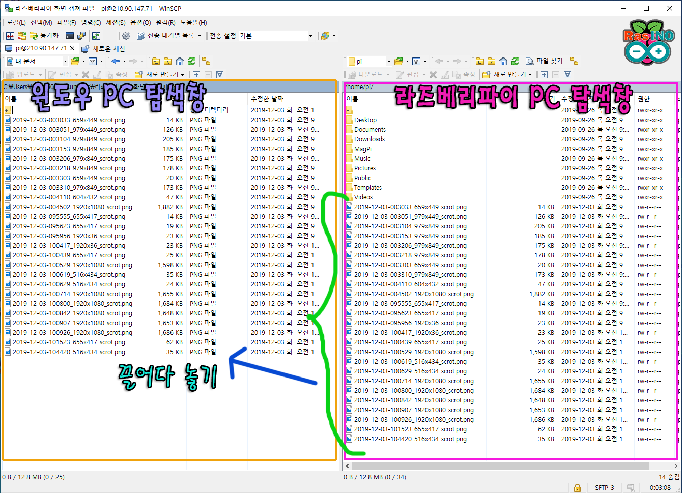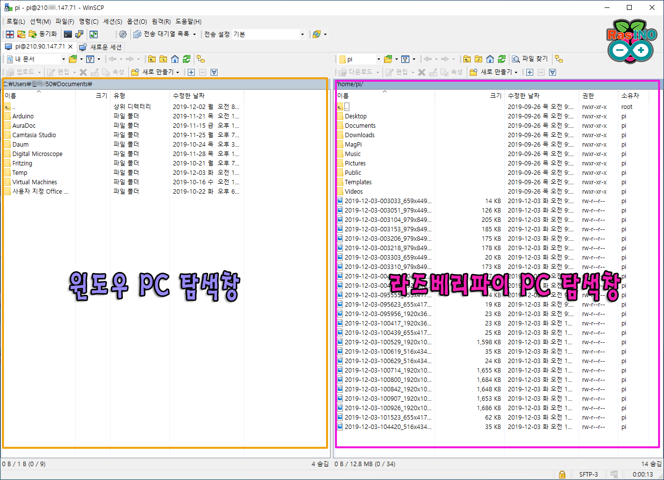 - 접속이 제대로 이루어 지면 아래 처럼 윈도우 PC 탐색창 화면과, 라즈베리파이 PC 탐색창 화면으로 각각 나뉘어진 창을 볼 수 있습니다. ( 라즈베리파이 첫 화면 위치는 ' /home/pi/ ' )