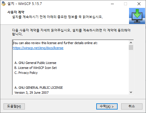 - 위 화면에서 DOWNLOAD WINSCP 5.15...xxx (9.4 MB) 버전을 다운 받는다.