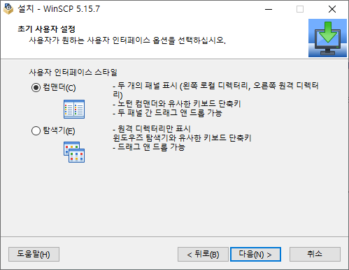 - 아래 화면에서, 파일을 복사해서 주고 받을 때에는 전통적인 FTP 스타일이 편하므로, 컴맨더(C)를 선택하는 것을 추천합니다.