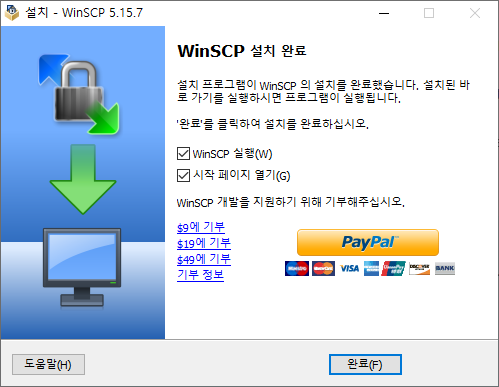 - 완료를 누르고 바탕화면에 있는 WinSCP 아이콘을 실행시킵니다.