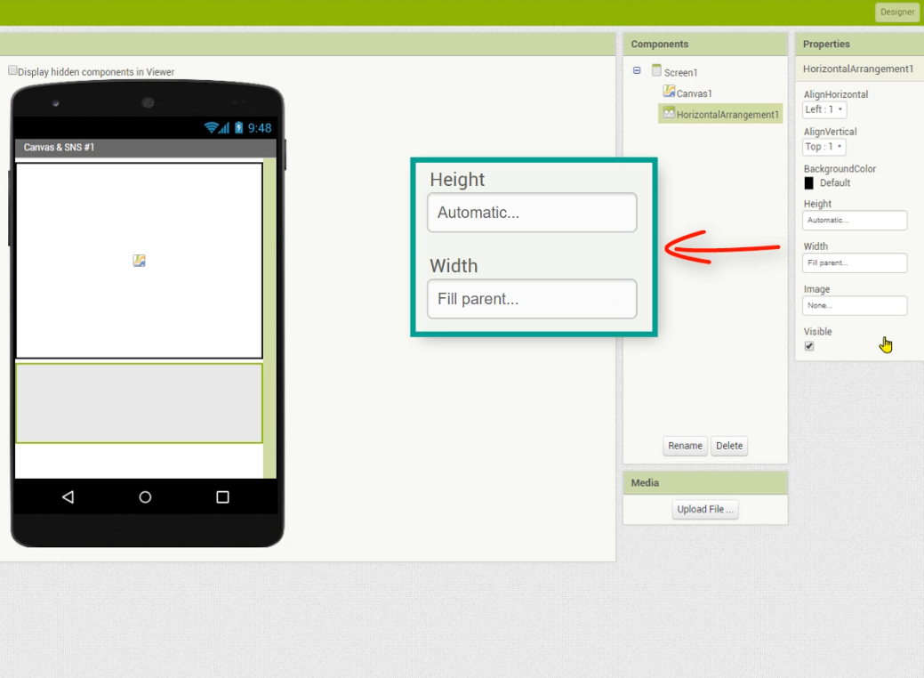 그리고 이 수평정렬 상자가 가로로는 꽉 채우도록 Fill parent로 하지만, 높이는 버튼 크기에 따라 자동으로 맞추어 지도록 Automatic 상태 그대로 둡니다.