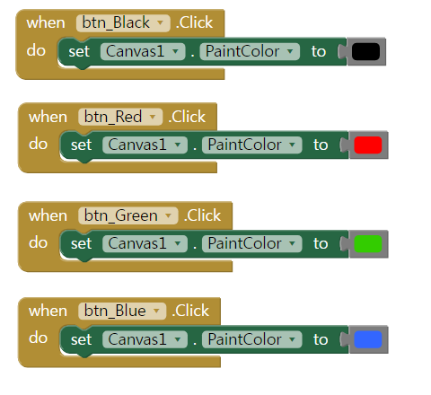- 색상 선택을 위한 버튼들의 블록 코딩