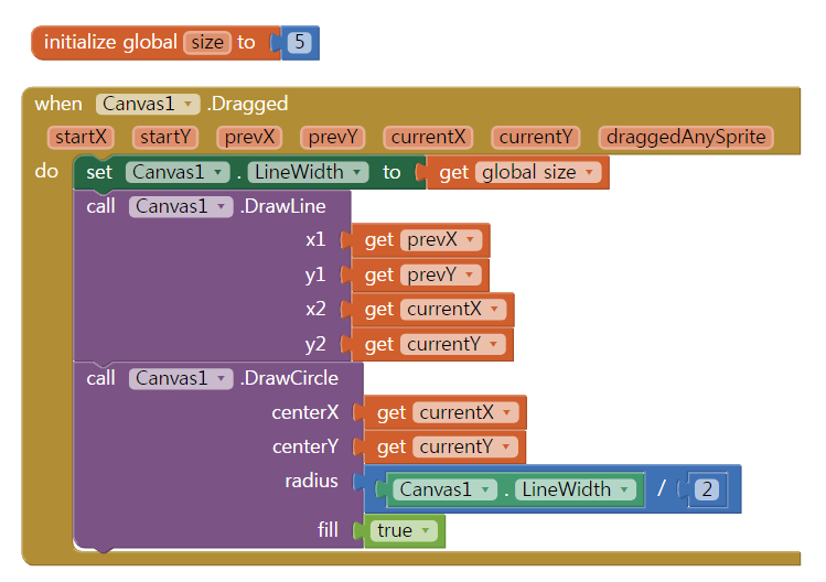 - 캔버스의 블록 코딩과 라인굵기 선택을 위한 전역변수(size) 선언