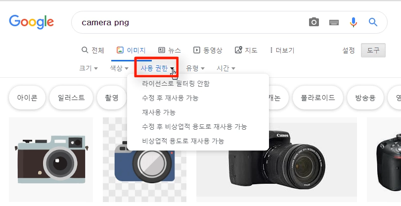 앱 버튼에 넣어줄 이미지를 위해 보통 구글등에서 검색하실 텐데요, 그냥 보이는 사진을 그 대로 사용하기 보다는, 저작권등에도 신경써서 하시는 것이 좋습니다. camera png 또는 camera icon 등으로 검색한 다음 도구 메뉴를 클릭하면 나타나는 사용권한 메뉴를 눌러보세요.