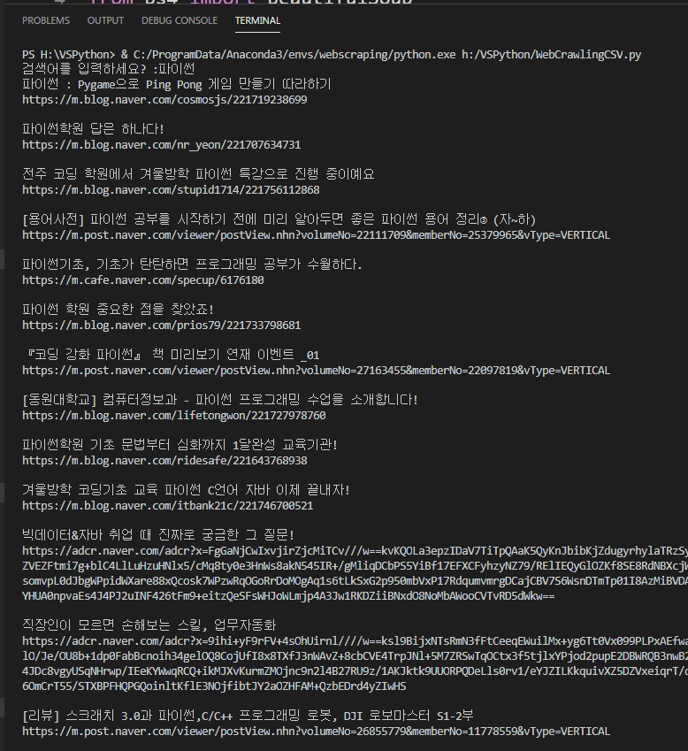 이 번 내용에서는 웹 검색 결과를 스크래핑하여 쉼표 단위로 저장이 되는 csv 형태로 저장하고자 한다.