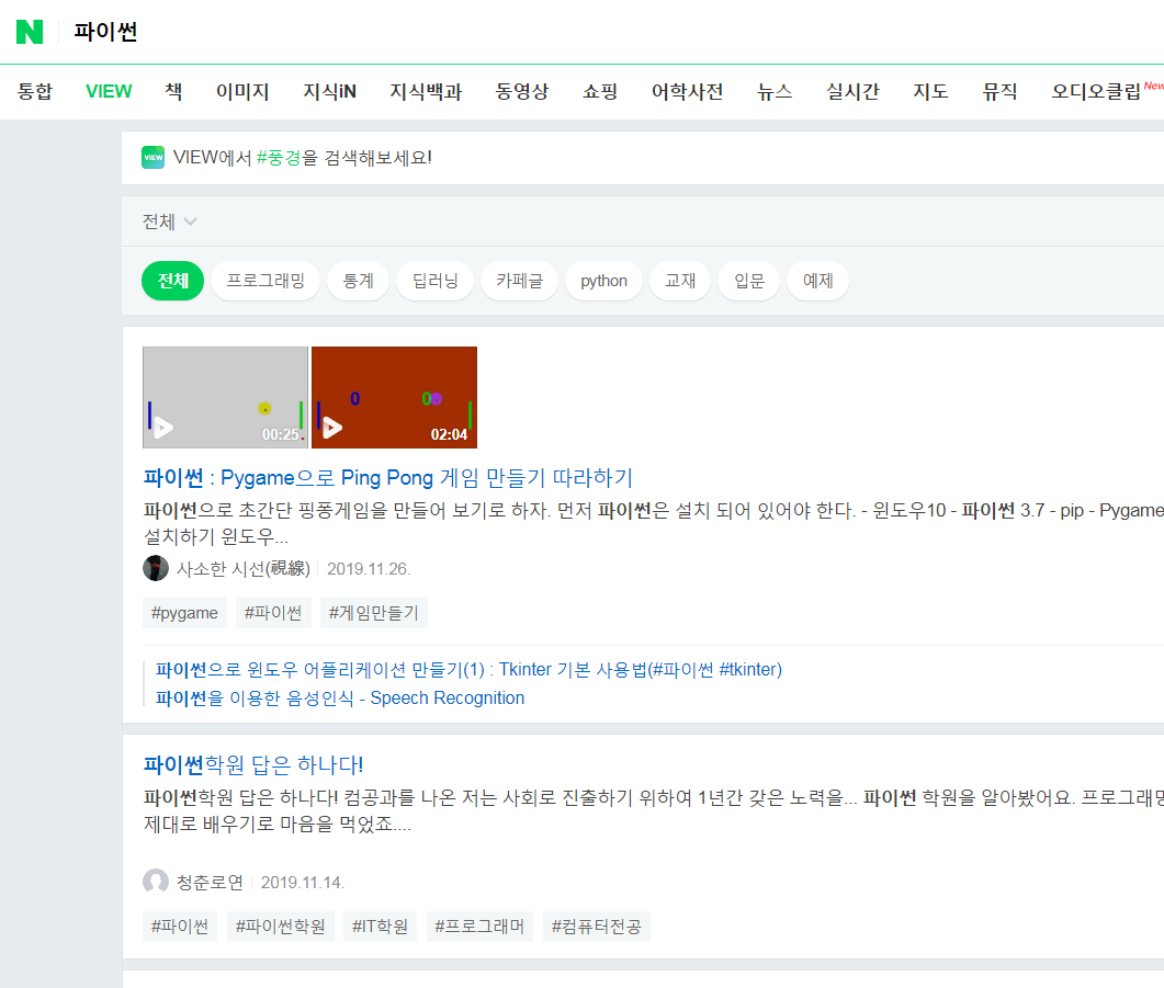 검색창에 '파이썬' 검색을 입력하고 검색한 후 메뉴에서 View 를 클릭해서 보면,