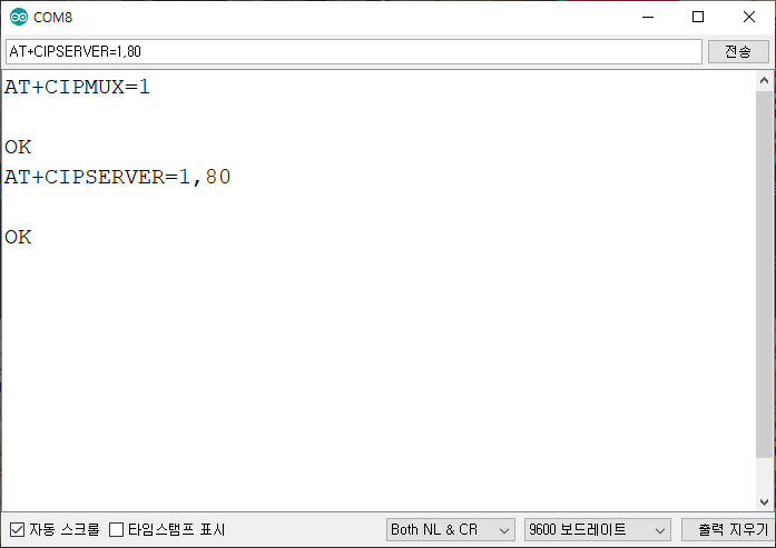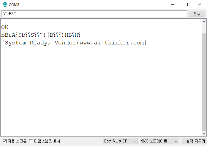 - 시리얼 모니터 통신속도는 9600으로 하세요. esp8266의 통신속도를 9600으로 했다면, 시리얼 통신 속도도 9600으로 해야, 본 게시글에서 안내드리는 AT명령어 대부분이 적용됩니다.