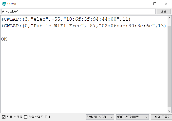 : 주변의 AP(WiFi공유기) 리스트를 시리얼 모니터 창에 출력 명령