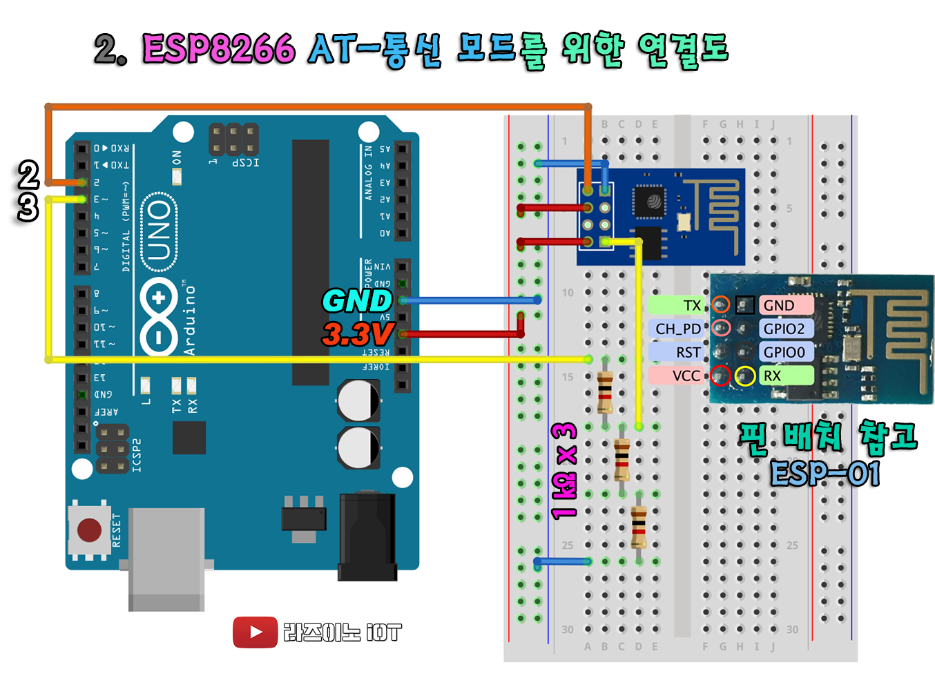 (아두이노의 Tx 와 esp-01의 Rx와 연결하고, 아두이노의 Rx와 esp-01의 Tx와 교차로 연결하여야 통신이 됨)