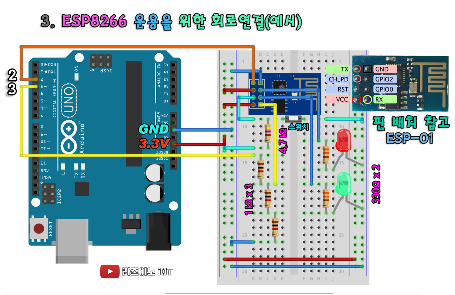 아두이노의 3번 단자를 송신단자(Tx)로 지정했으면, 여기에 esp-01 모듈의 Rx 단자로, 교차하도록 연결이 되는 식입니다. 이렇게 해야 서로간 데이터를 주고받을 수 있는 통신이 이루어 집니다.