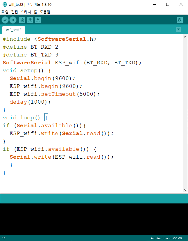 ※ 위 이미지 처럼 펌웨어 업로드가 완료되면, 아래에 있는 AT-통신모드용 아두이노 연결을 통해 , 아두이노의 시리얼 통신창을 통해 AT통신 모드로 진입이 된다. 이때 아래와 같은 AT통신을 위한 아두이노 코드를 아두이노에 새로 업로드 해주어야 한다.