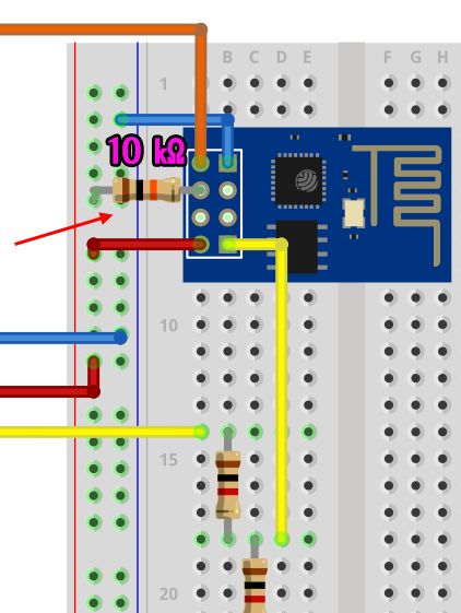 - 만약 위 회로 연결대로 하였으나, AT통신이 안 될 경우 CH_PD 단자와 +전원(3.3v) 사이에 10㏀ 저항을 넣어서 실행해보기 바랍니다.