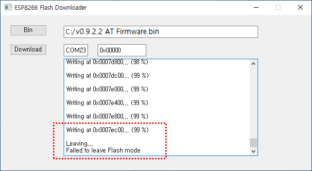 끝에 표시된 ' Failed to leave Flash mode ' 글자는 펌웨어 업데이트와는 관계없으니 무시하셔도 됩니다.