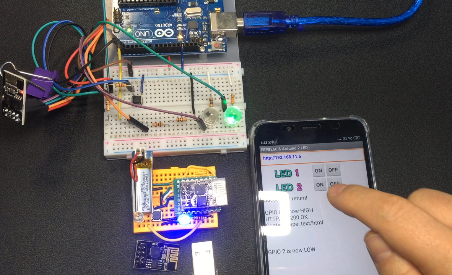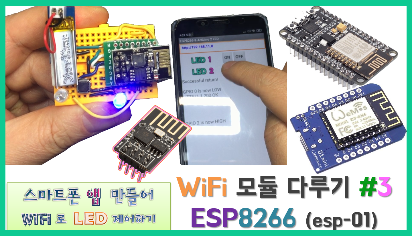 - 아두이노를 이용한 esp01 회로와, 휴대용으로 만든 미니 esp01 버전 두 가지를 놓고 IP번호를 선택해가며 테스트 해볼 수 있습니다.
