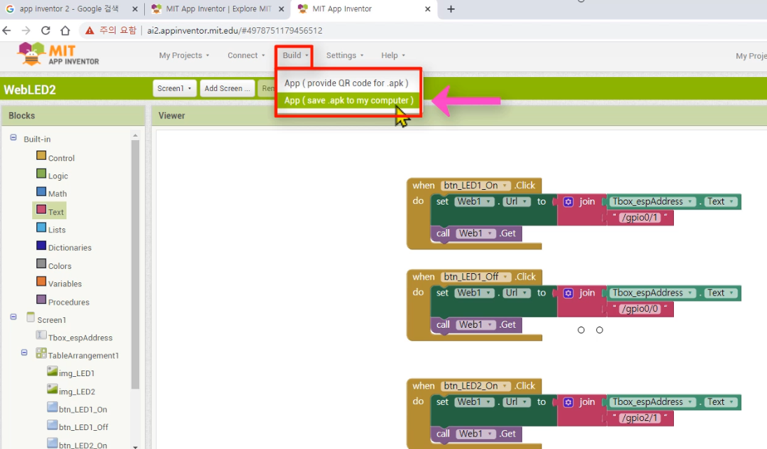 * 2. 앱인벤터를 이용하여 접속앱을 직접 제작 한다.