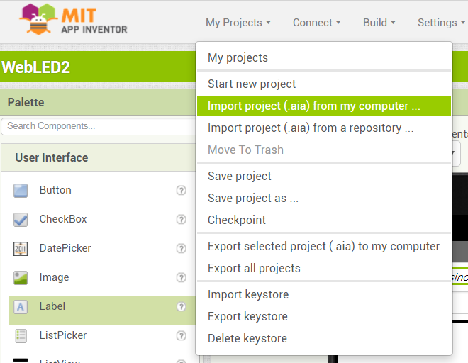 앱 인벤터 메뉴중 아래 Import project (.aia) from my computer... 메뉴를 통해 다운받은 위의 첨부파일을