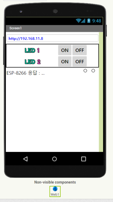 * 4. 앱화면의 버튼을 눌러 LED를 On·Off 할 수 있다.(GPIO0(LED1), GPIO2(LED2))