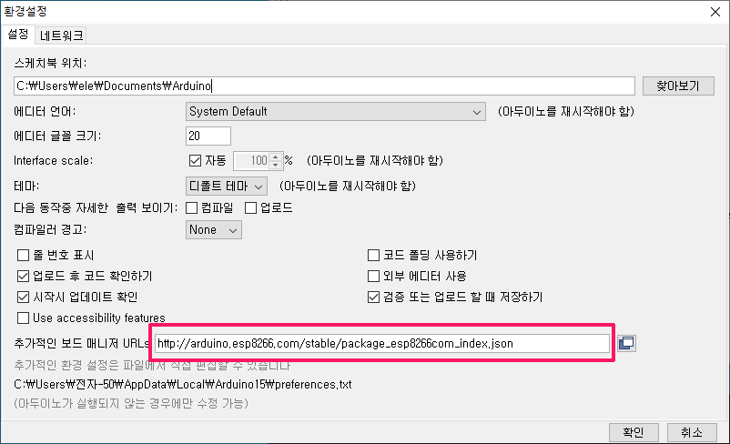 환경 설정 주소 : http://arduino.esp8266.com/stable/package_esp8266com_index.json
