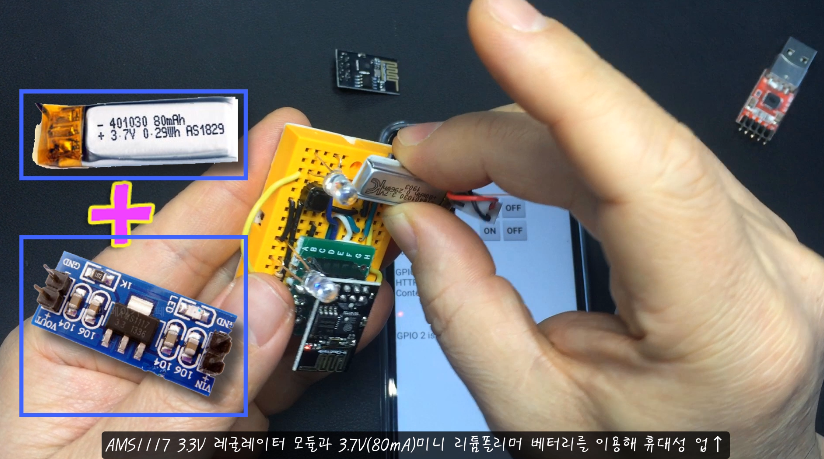 - 아래 이미지 처럼, AMS1117 3.3V 레귤레이터 모듈과 3.7V(80mA) 소형 리튬폴리머 배터리를 이용하면 휴대성이 업된 미니 WiFi 기기를 만들 수 있어요.